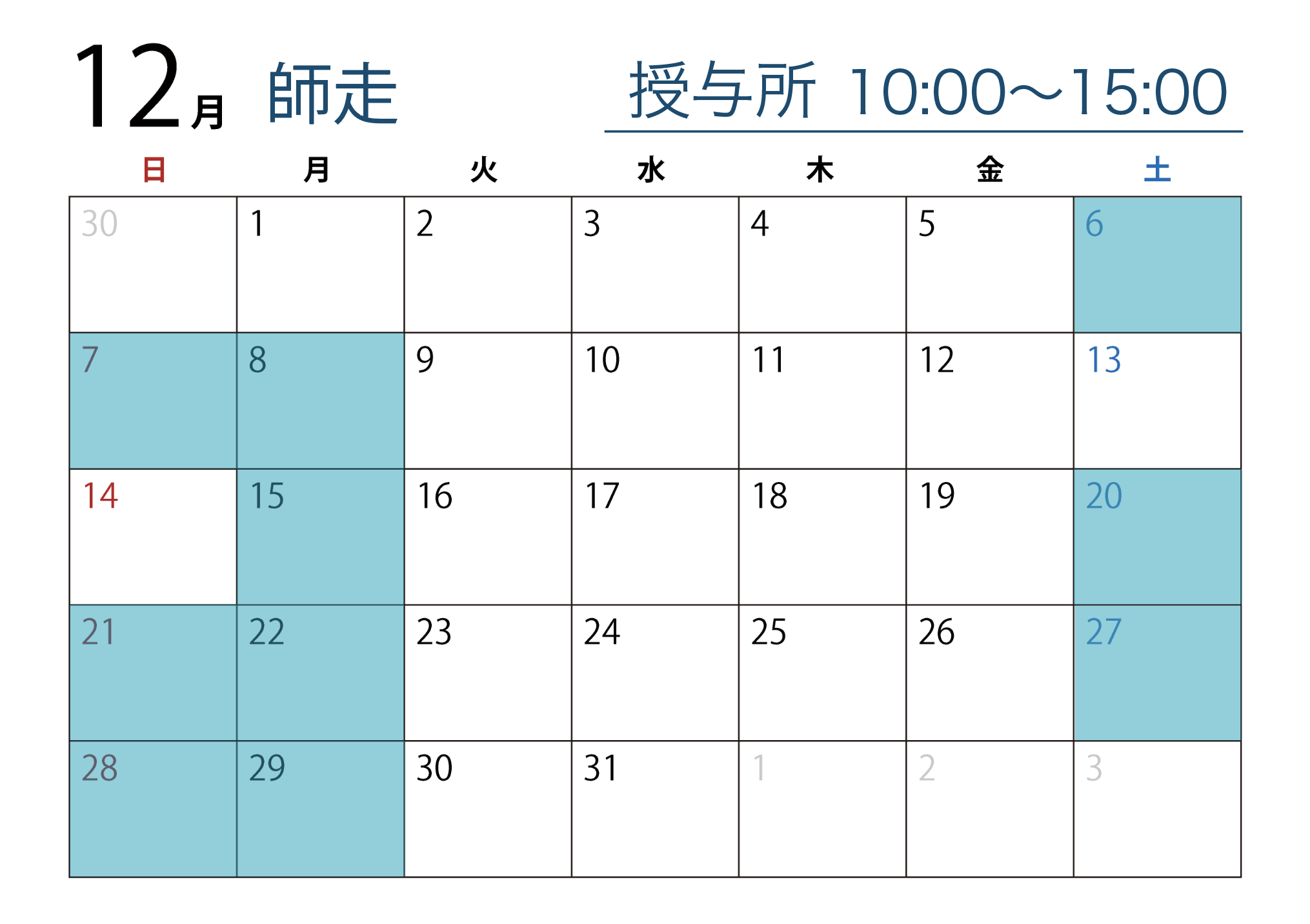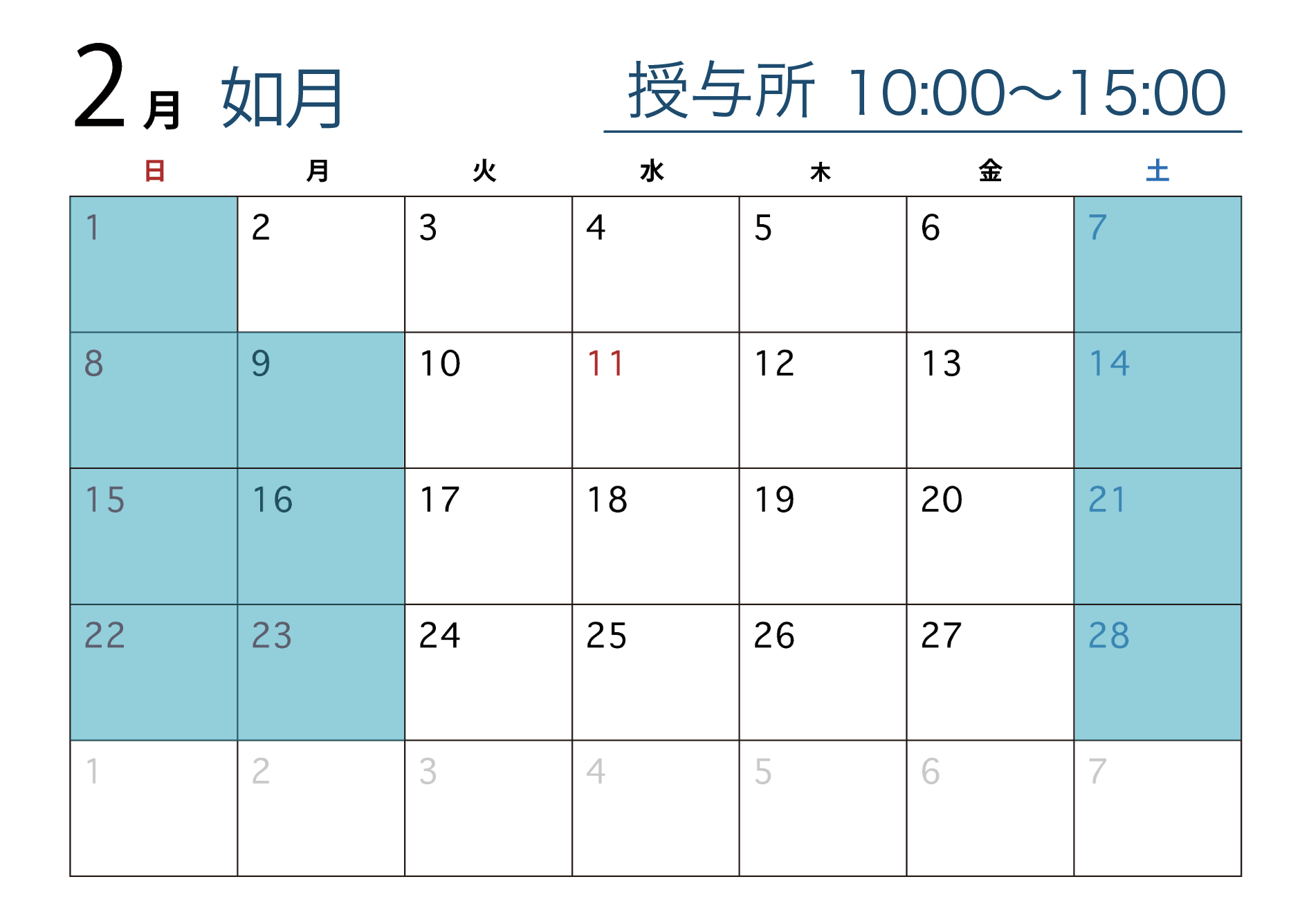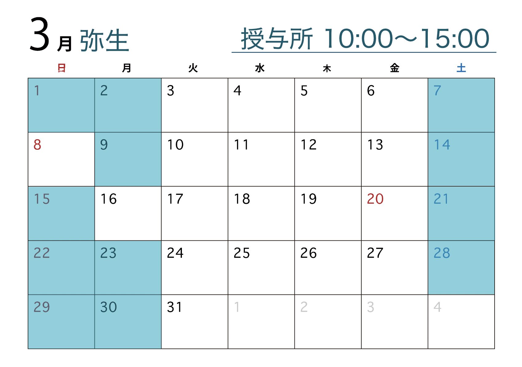 青色で示された日程にて御朱印、御守り等の授与を行います。