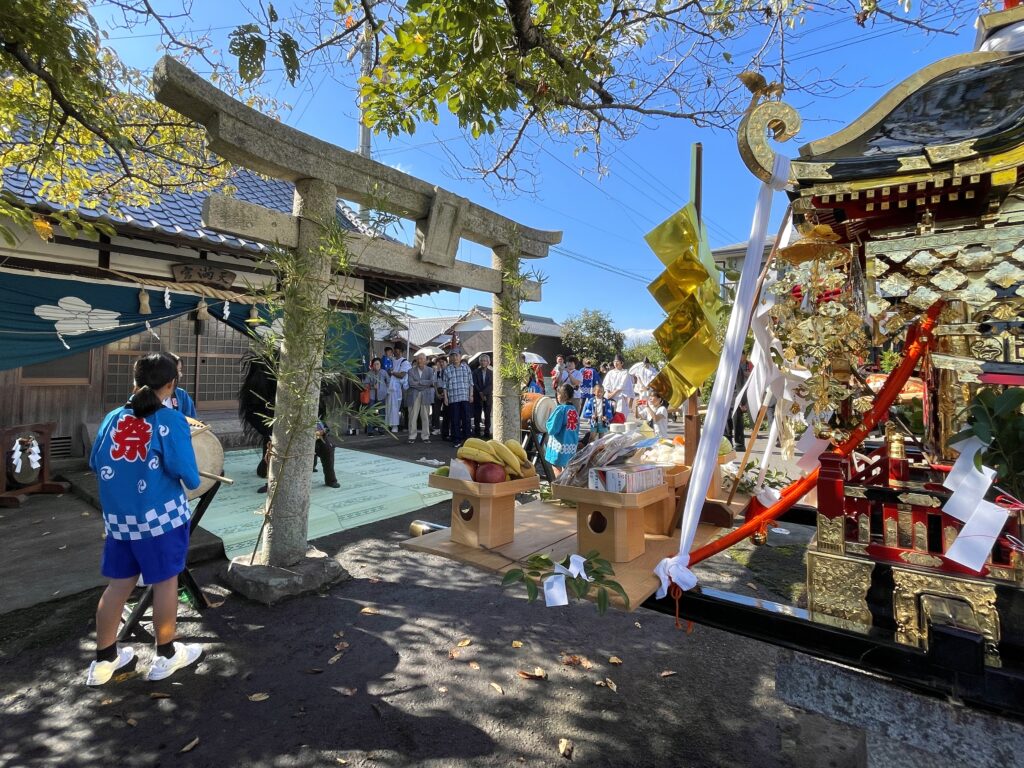 兼務社である丸亀市三条町の日吉神社では、秋の例祭が斎行されました。朝方は雨が降っておりましたが、祭りが始まるころには見事に晴れ渡り、お神輿の渡御が無事に行われました。氏子の皆さまが力を合わせて担ぐお神輿の姿に、地域の結束と伝統の力強さを感じました。境内では獅子舞や太鼓台も登場し、子どもたちの笑顔と歓声に包まれる、まさに秋祭りらしい賑わいとなりました。